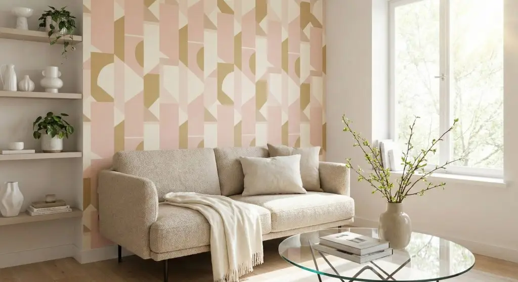 Pastel geometric wallpaper is trending for younger homeowners and apartment decor.