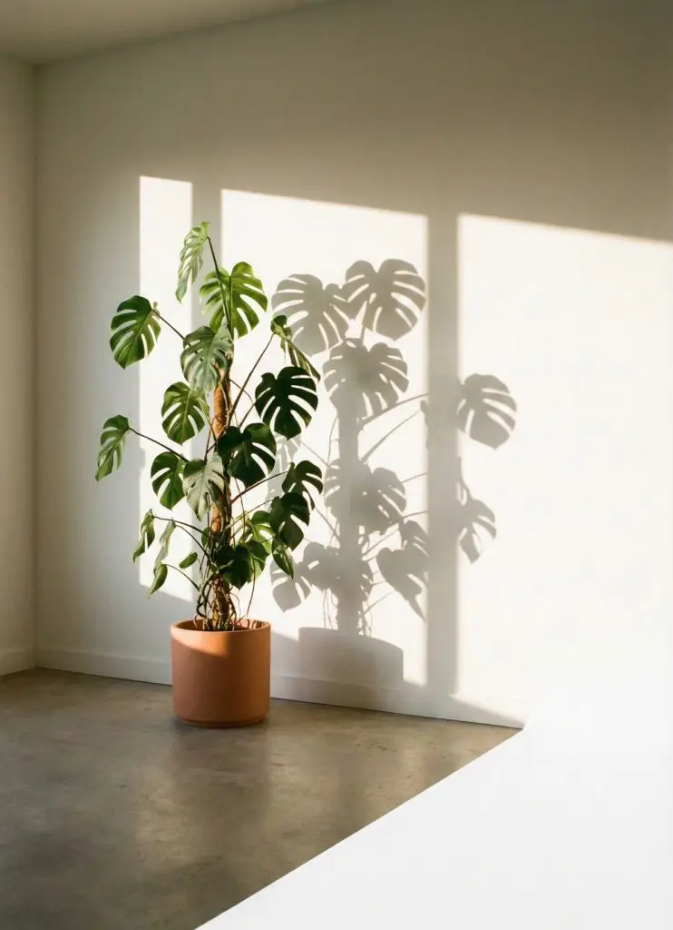Even a small spotlight effect can make leaves cast beautiful, dramatic shapes on the wall—literally living art.